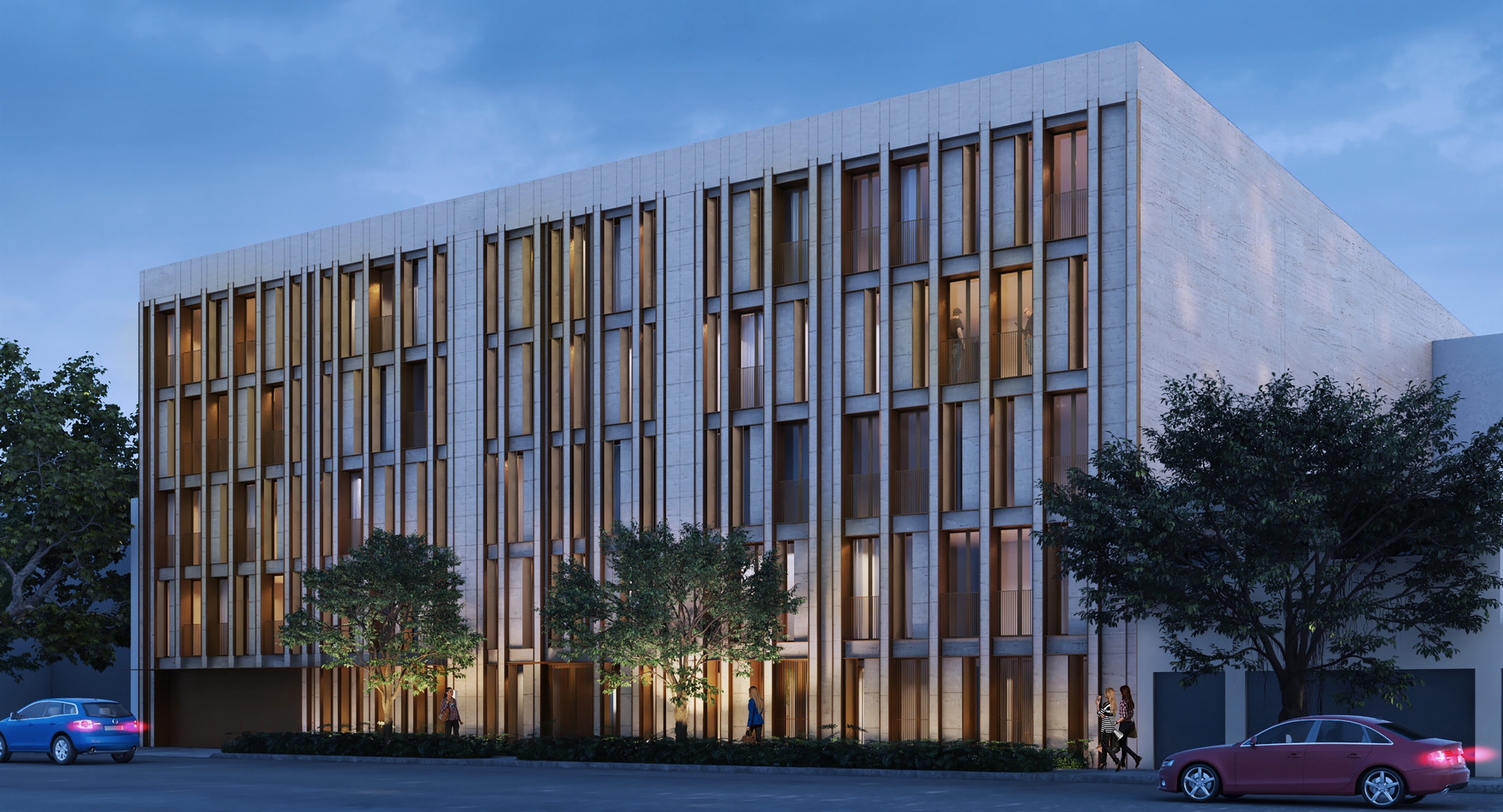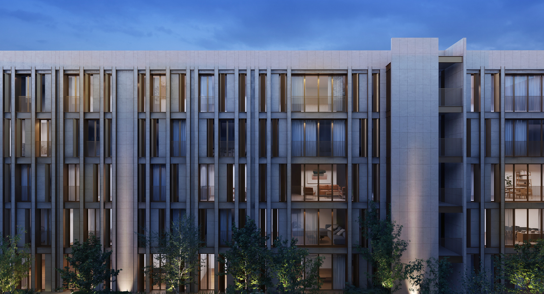 The building’s façade rhythm is defined by a contemporary interpretation of vernacular elements: framed windows, artisanal iron railings, and warm, tactile materials reflect the neighborhood’s character while expressing a modern architectural language. The structure avoids pastiche, instead choosing to celebrate history through abstraction, material honesty, and proportion.
