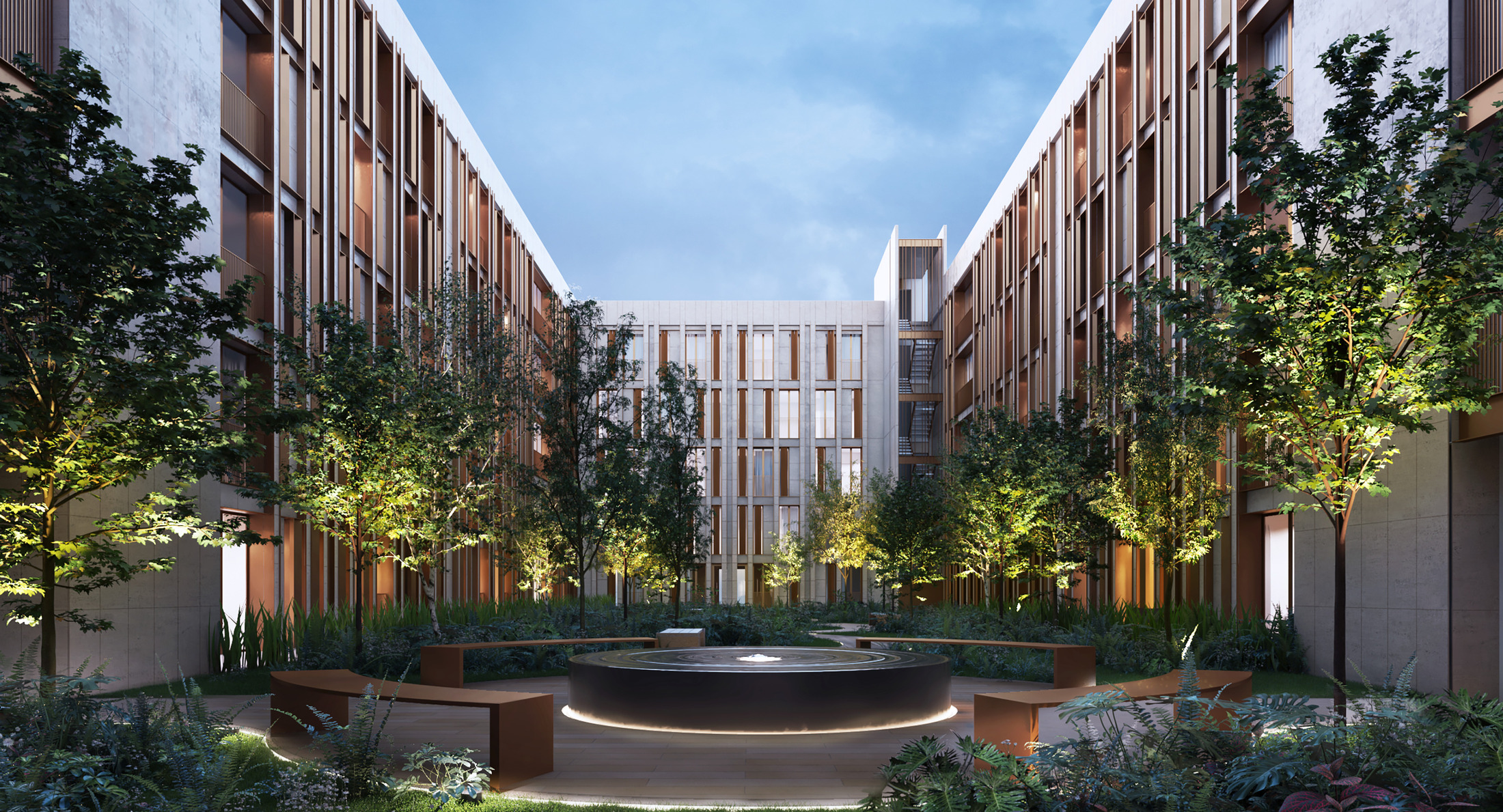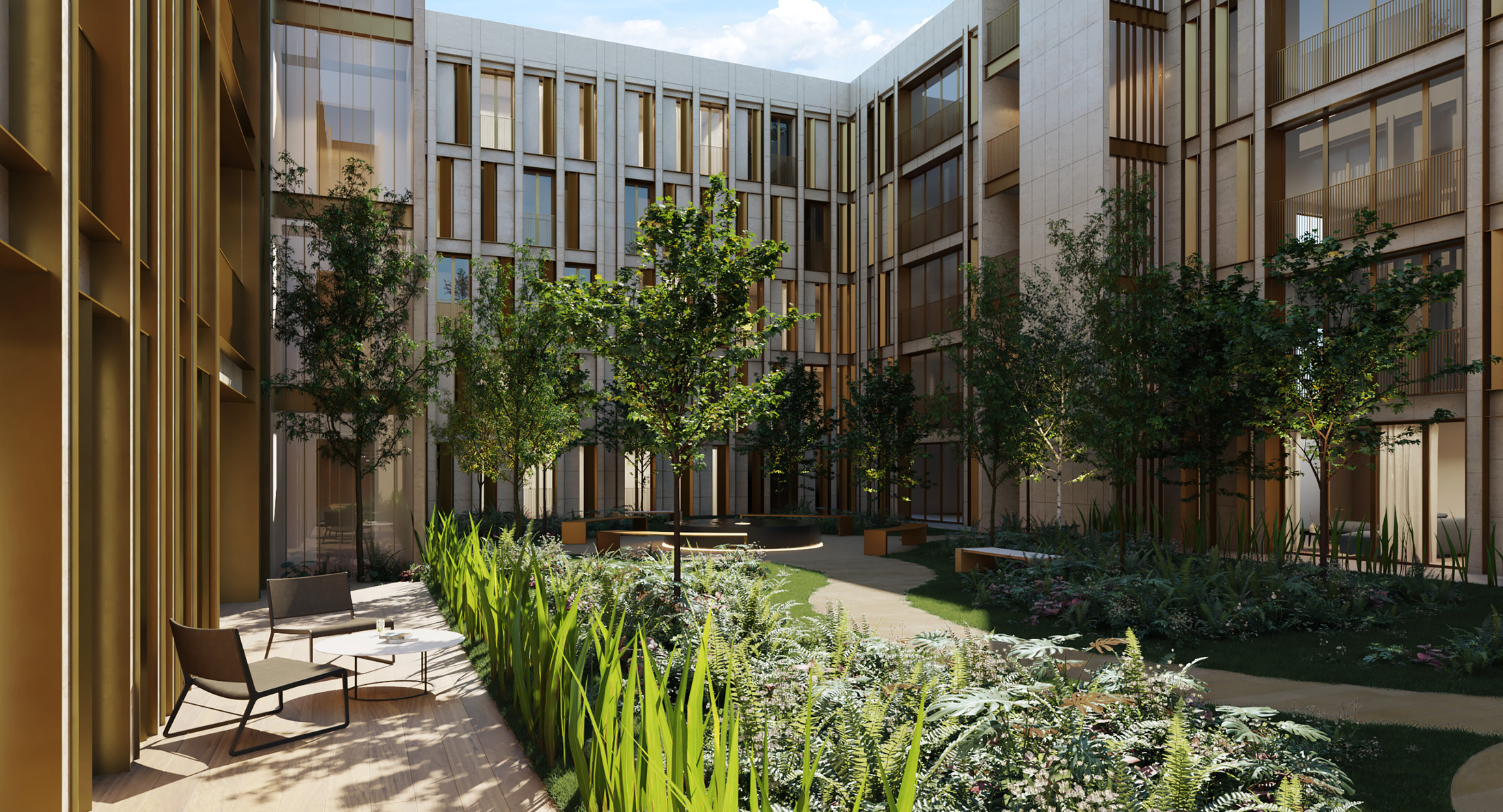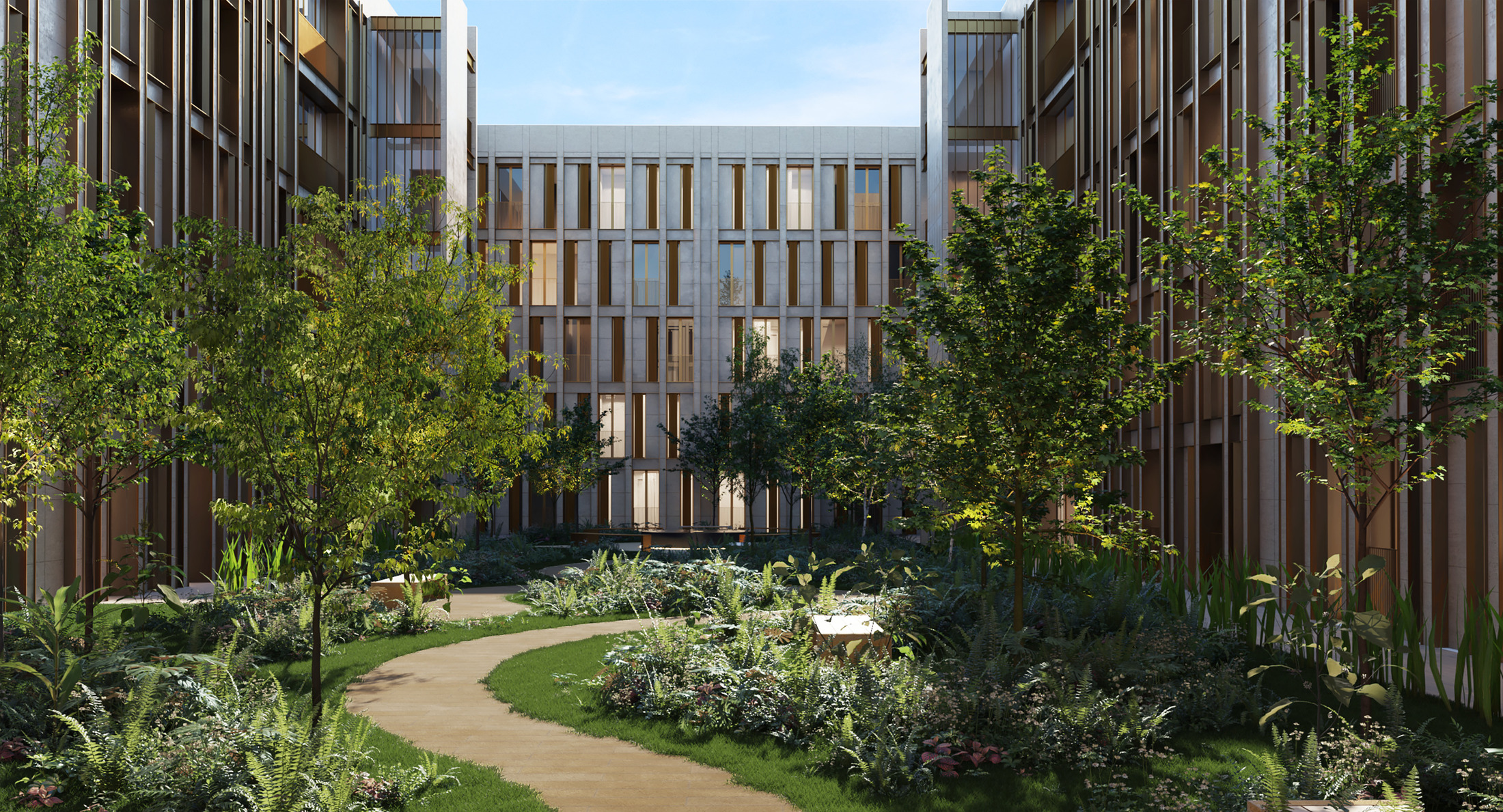 Above, the rooftop is transformed into a continuous garden loop, creating a unique amenity that encourages connection among residents. Designed as an elevated promenade, this space invites people to walk, rest, and interact as they would in a park—offering expansive views, shaded seating, and native landscaping that echo the gardens below.