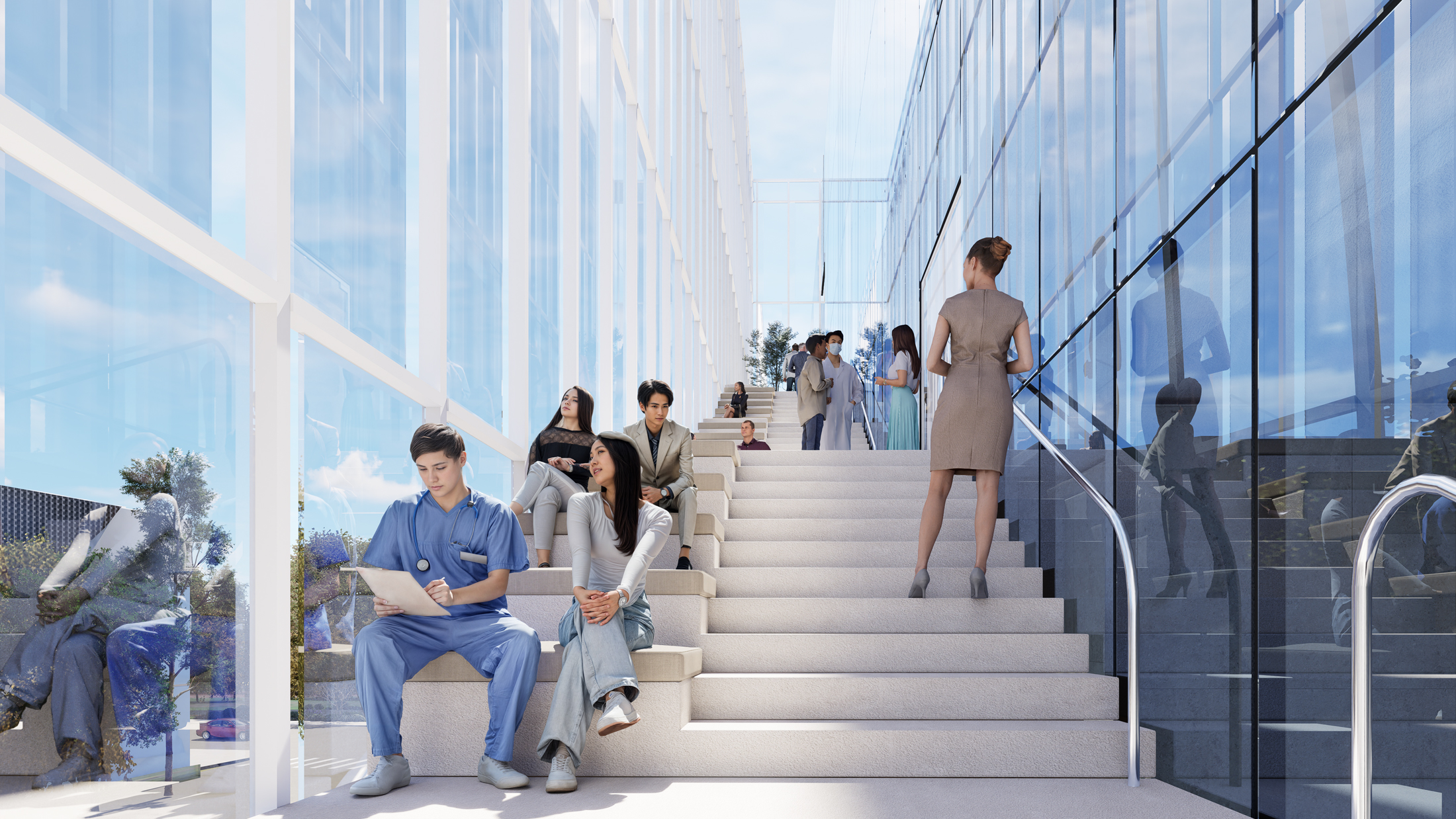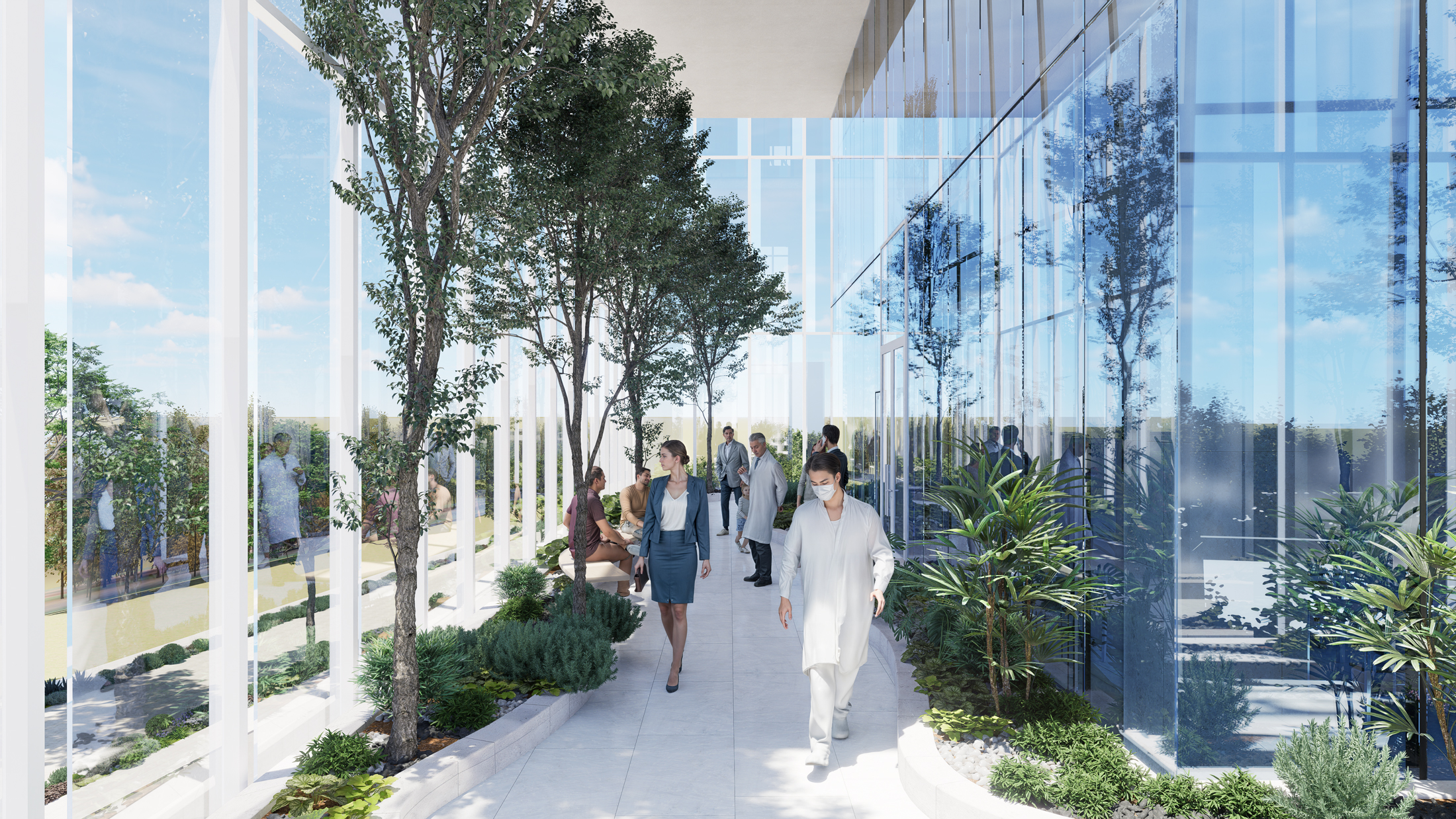 The design introduces a continuous loop that activates the façade and connects all levels of the building through a single, uninterrupted path. This loop extends outward to form a green buffer between the hospital and the street—an intermediate space that protects, nurtures, and inspires. Lush vegetation softens the building’s edges while offering patients and healthcare professionals calming green views that reduce stress and provide moments of respite.