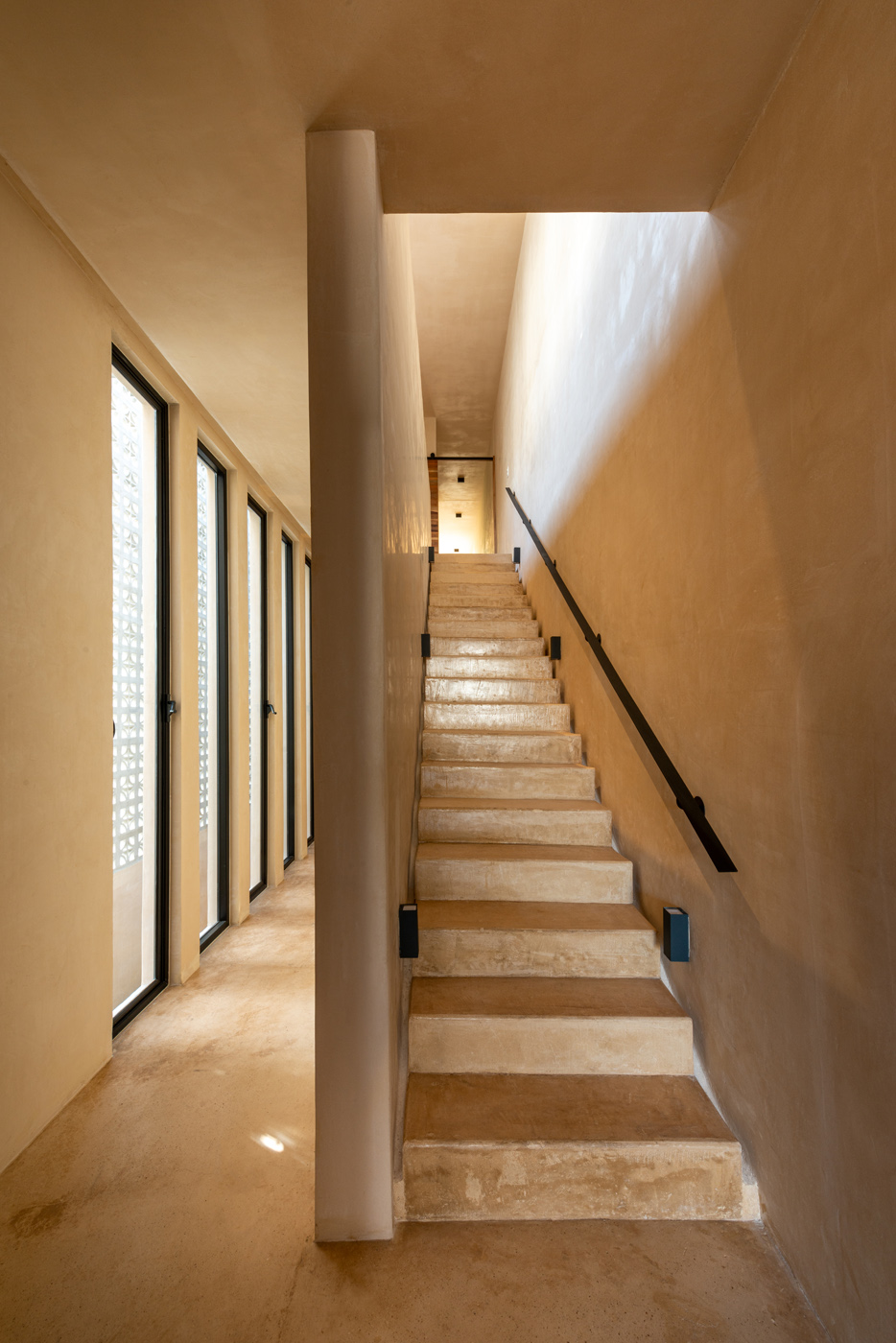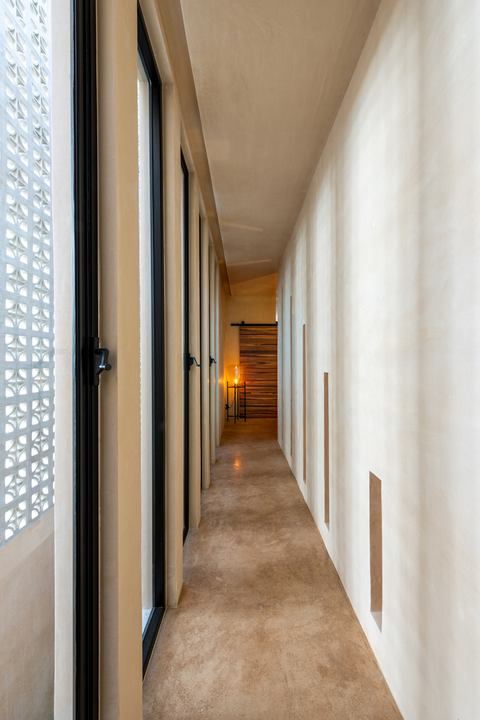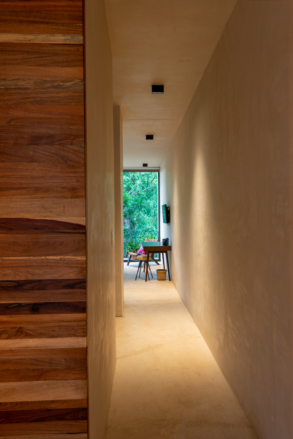 From a construction standpoint, the house uses a simple, efficient system of load-bearing concrete block walls and prefabricated slabs. The ceilings incorporate a dropped system to house MEP installations. Finishes are kept natural and locally sourced: all walls are coated in Chukum, a traditional Yucatecan lime-based stucco derived from tree resin, offering both durability and aesthetic warmth. Floors and slabs are polished concrete in a tone that harmonizes with the Chukum, maintaining visual continuity throughout.