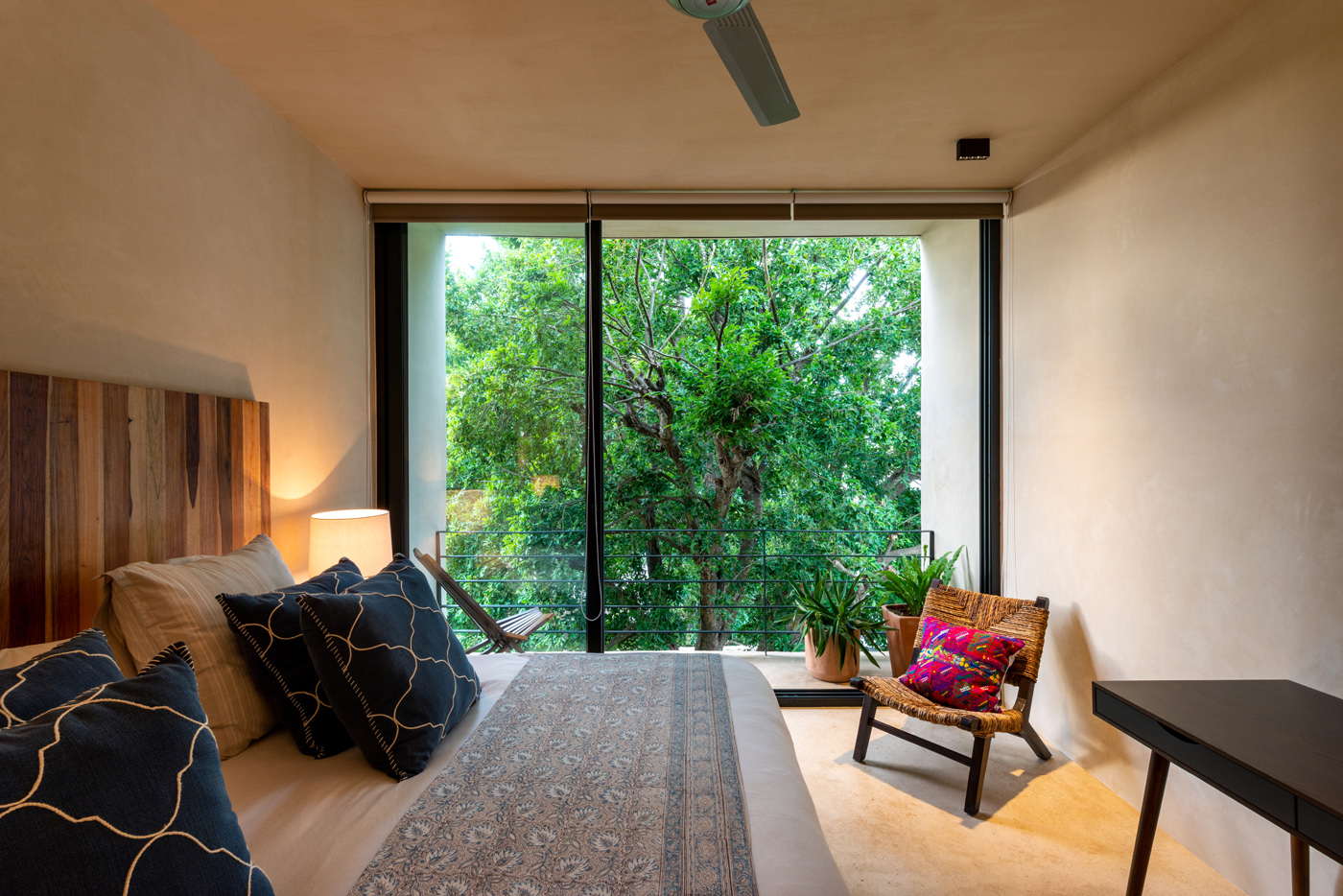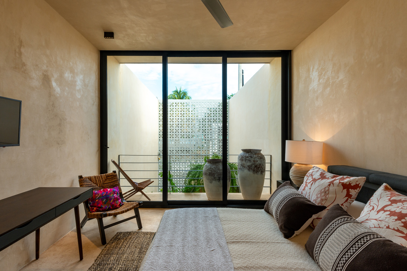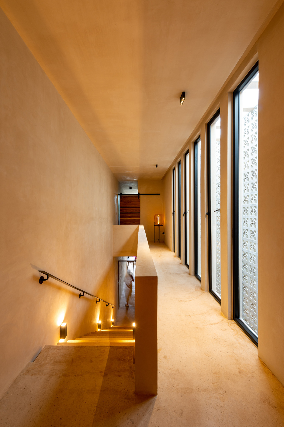 From a construction standpoint, the house uses a simple, efficient system of load-bearing concrete block walls and prefabricated slabs. The ceilings incorporate a dropped system to house MEP installations. Finishes are kept natural and locally sourced: all walls are coated in Chukum, a traditional Yucatecan lime-based stucco derived from tree resin, offering both durability and aesthetic warmth. Floors and slabs are polished concrete in a tone that harmonizes with the Chukum, maintaining visual continuity throughout.