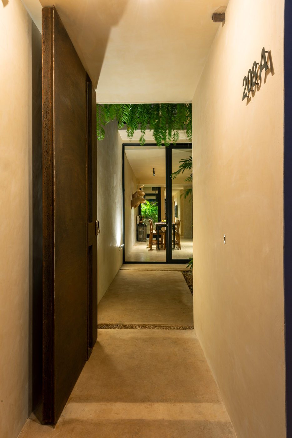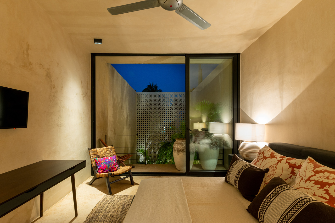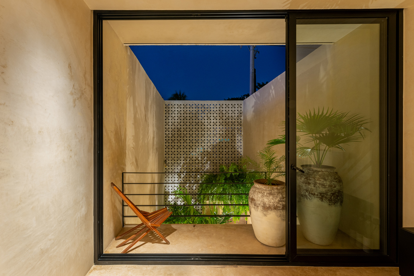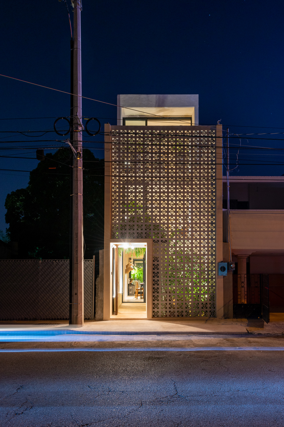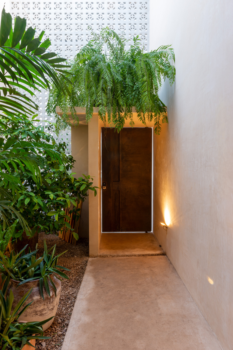 The north-facing main façade features a traditional Yucatecan lattice screen—a reinterpretation of local craftsmanship that filters light and frames the internal garden while preserving privacy. During the day, the lattice subtly reveals the interior vegetation to passersby; at night, it glows like a lantern, softly illuminating the street with the filtered light of the home within.