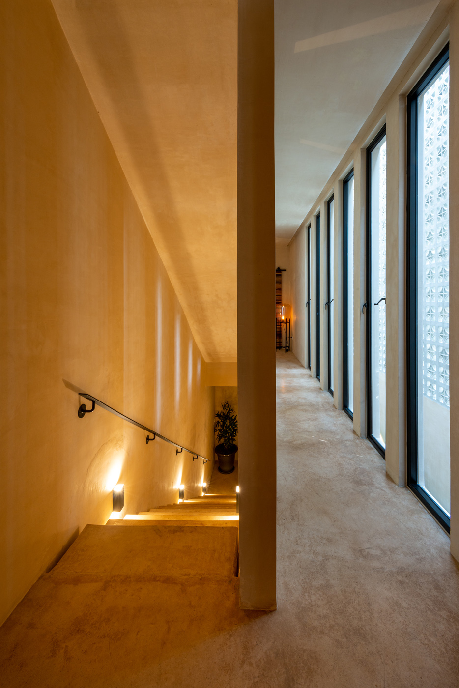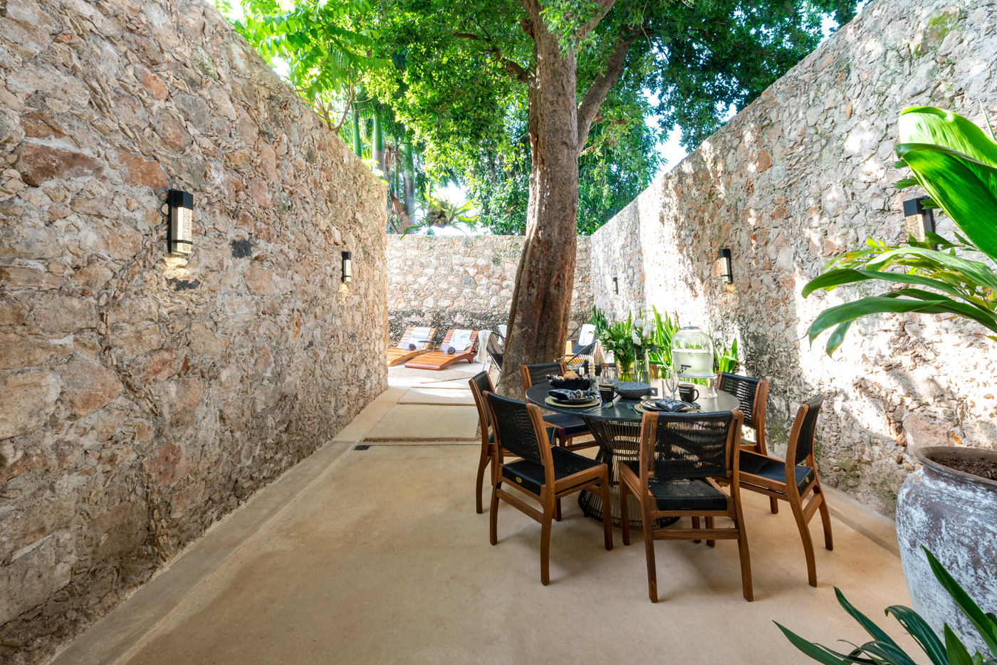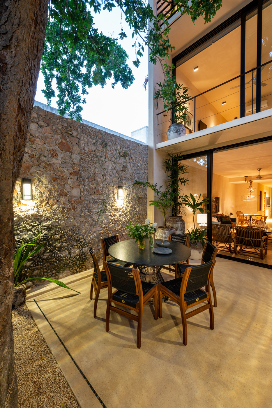 The third patio, in the rear of the house, is a dry garden framed by existing stone walls, where an original tree was preserved as a central feature. This shaded garden creates a serene outdoor extension of the living room, enhancing the experience of openness and privacy. An L-shaped path guides the user toward a small, secluded pool at the rear of the lot—an intimate and refreshing amenity designed to be both visually discreet and functionally restorative.