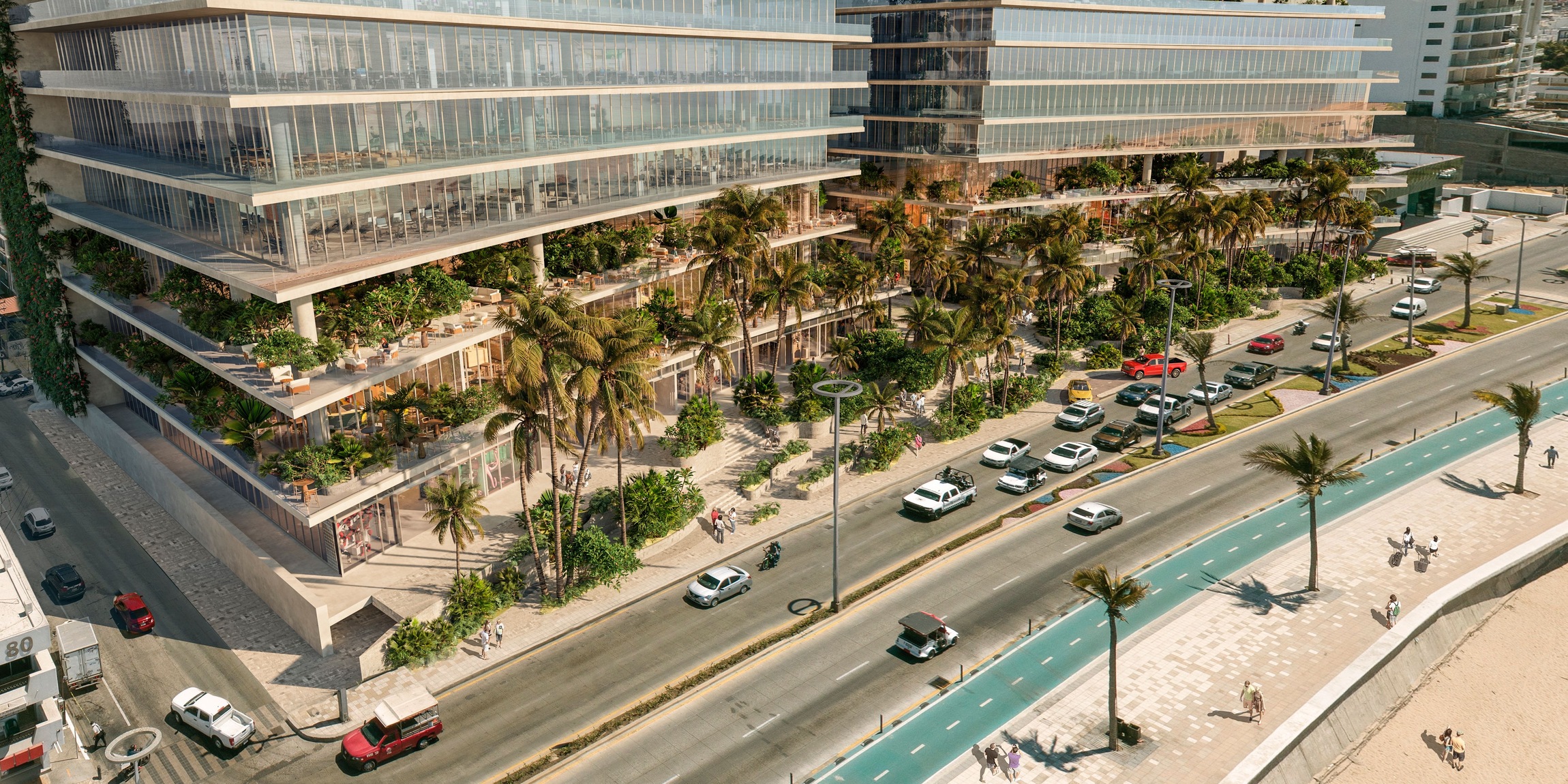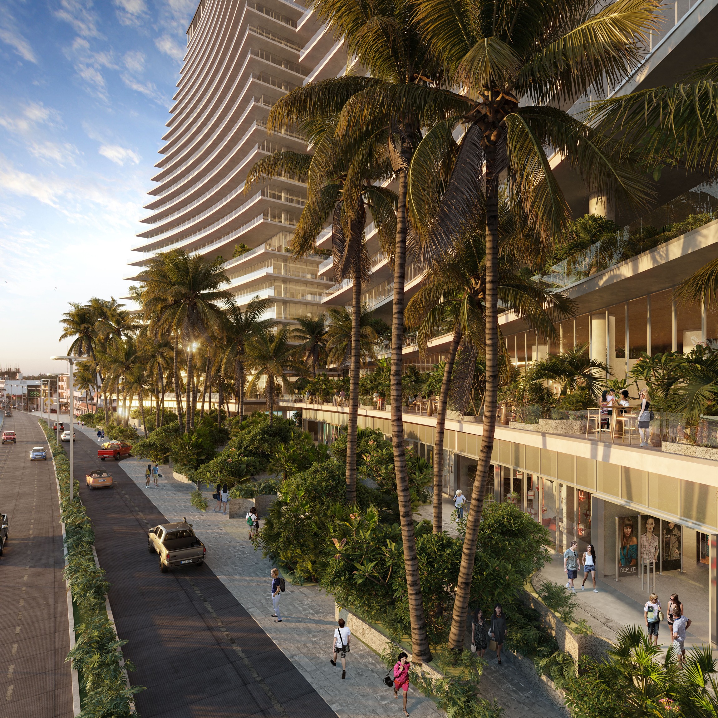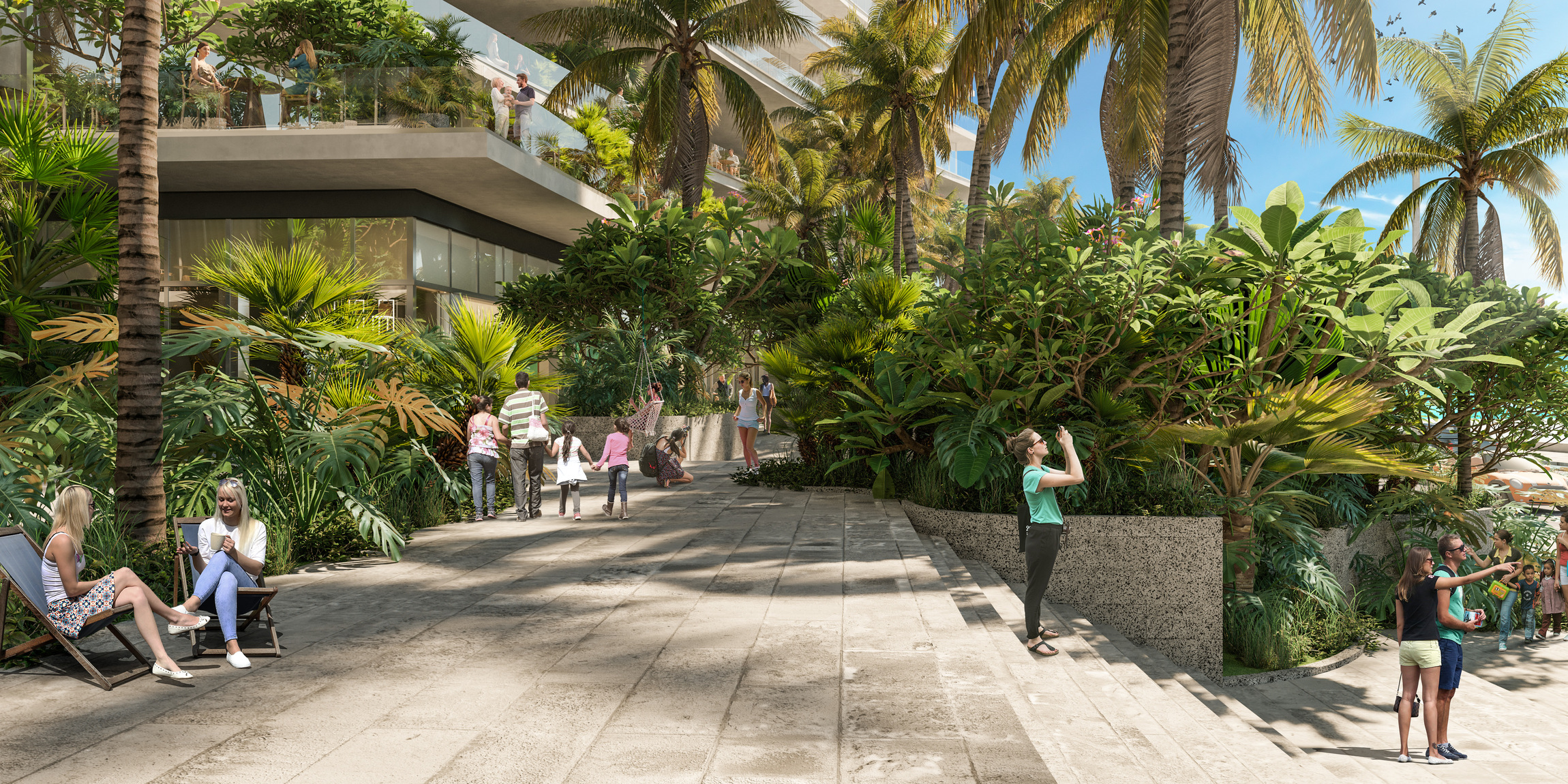 The retail and dining areas at ground level are enhanced with expansive terraces, lush gardens, mature trees, and water features that offer shade, freshness, and comfort to both visitors and residents. These elements create a vibrant, walkable environment that activates the street and connects seamlessly with the beach and boardwalk.
