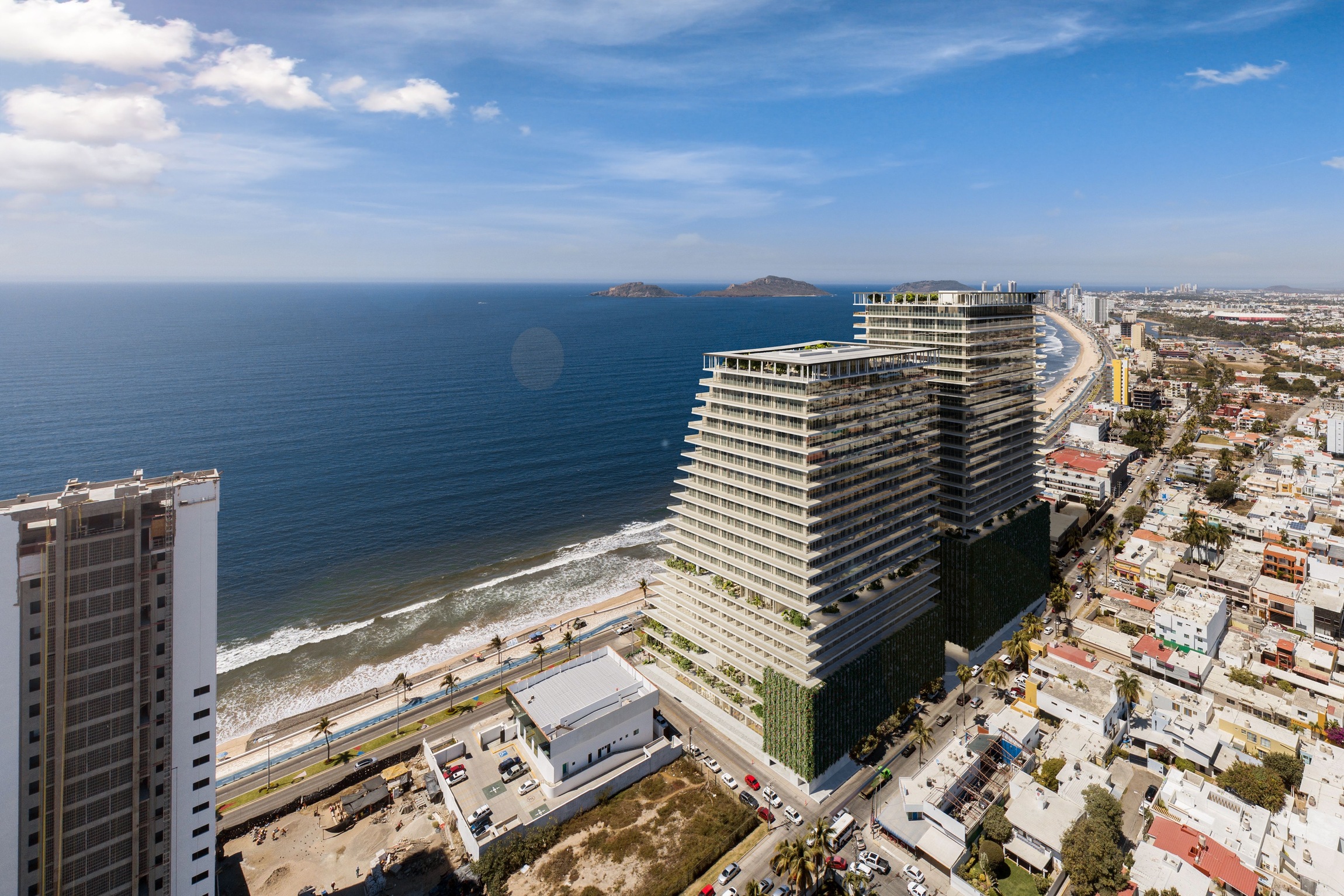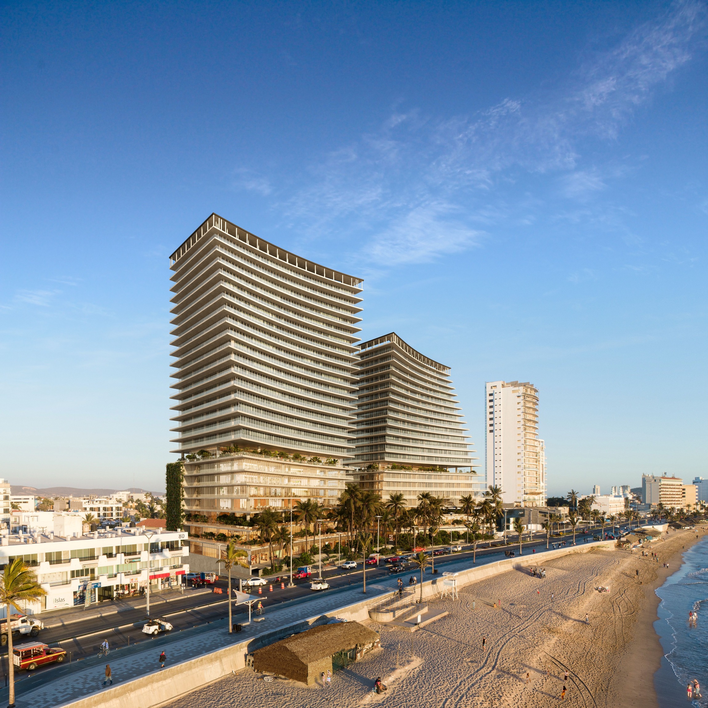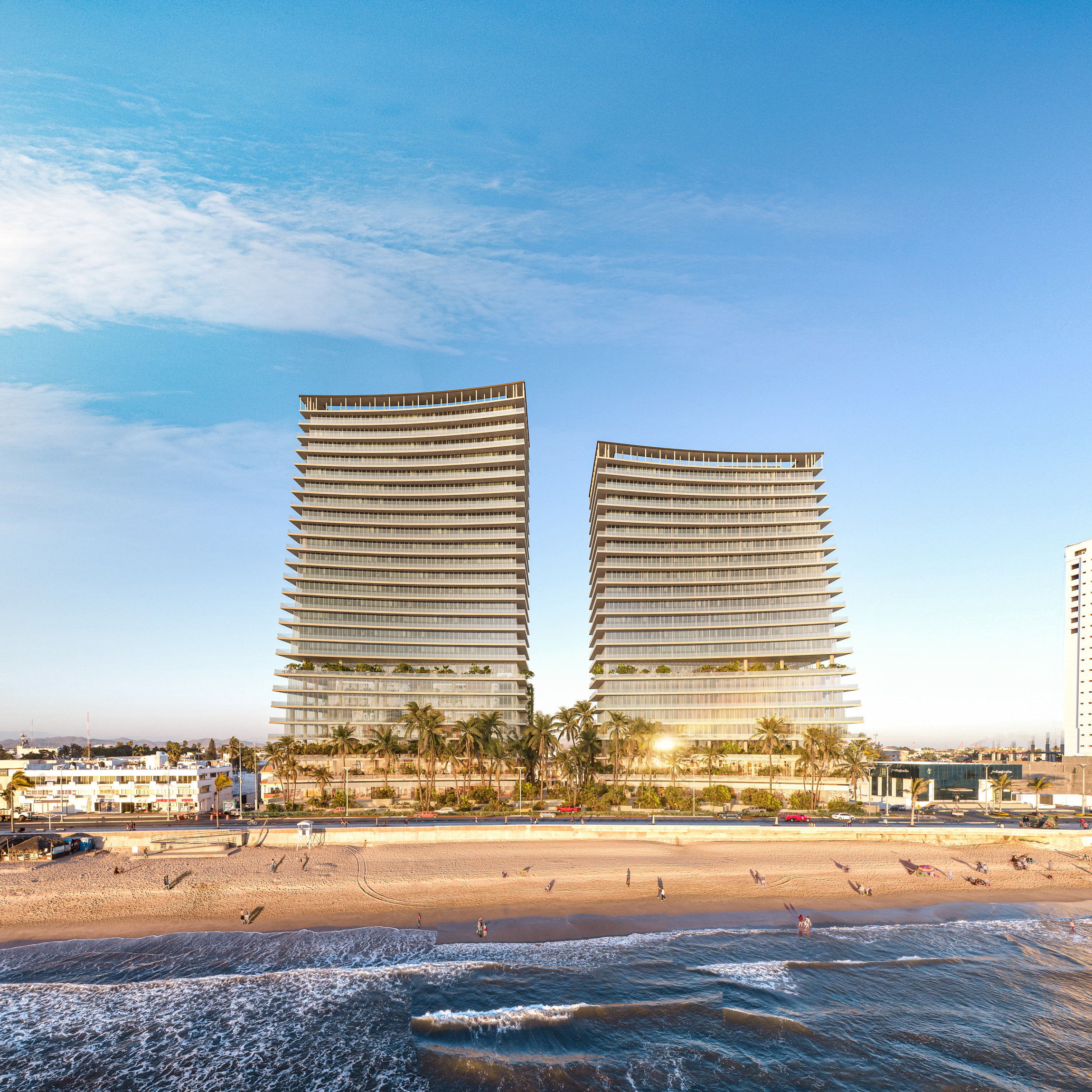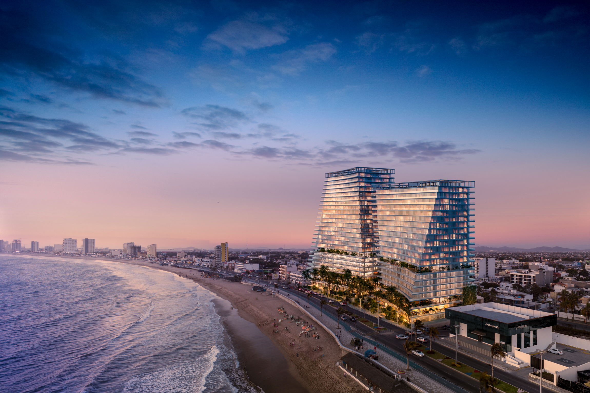 Agua Marina is a new mixed-use development located on the Pacific Oceanfront of Mazatlán, Sinaloa, Mexico. Strategically situated between the historic downtown and the emerging Cerritos district, the project faces the city’s most iconic public space—the famed boardwalk, or malecón. This vibrant waterfront promenade not only connects both ends of the city but also serves as a social and cultural hub, where residents and visitors gather year-round for public events, celebrations, and to simply enjoy the breathtaking ocean sunsets.