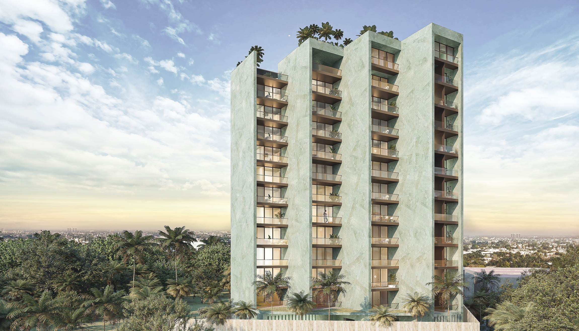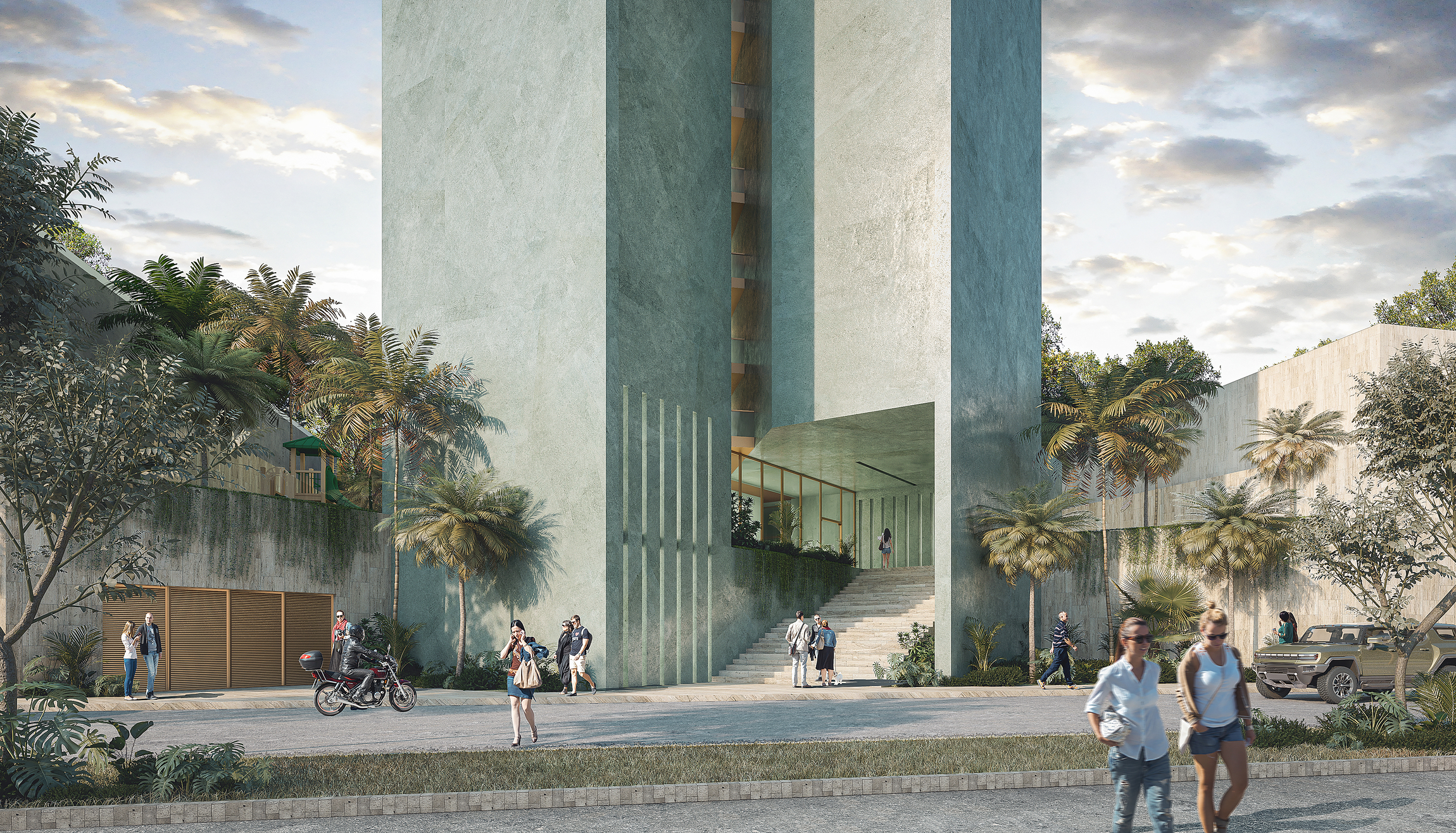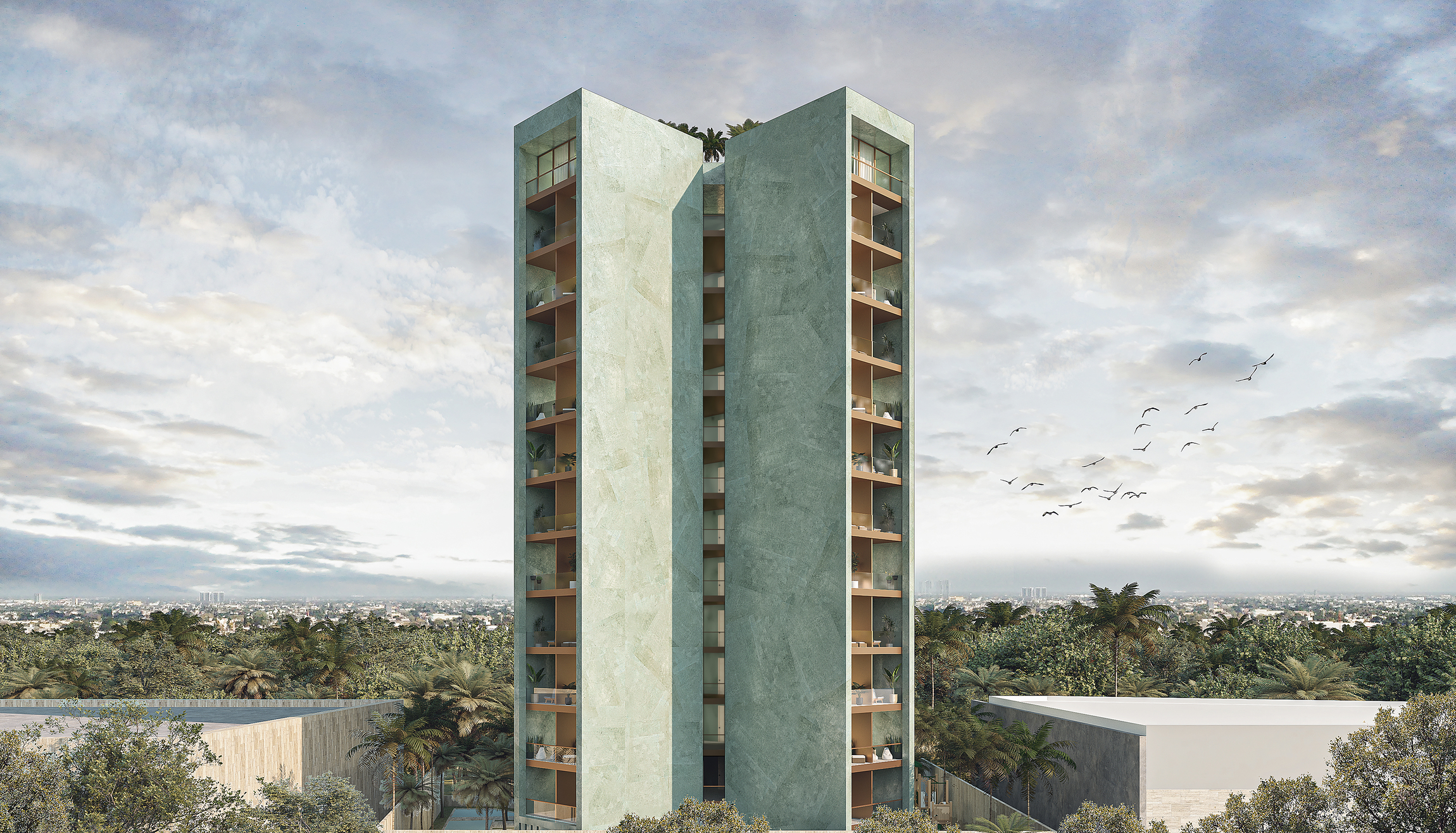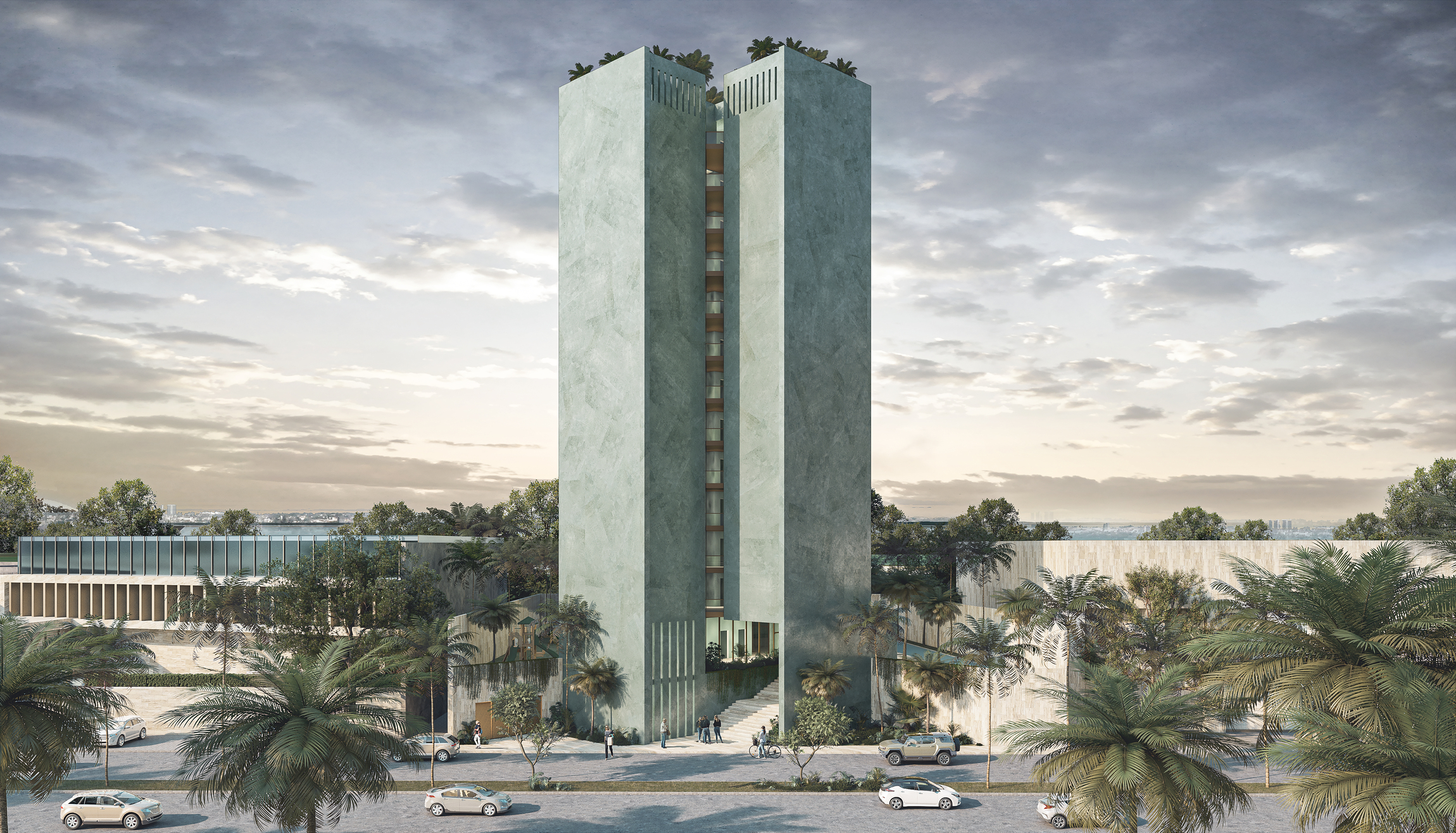 The two towers mirror one another, linked by shared horizontal circulation corridors and anchored by a central vertical core. Seen from the street or the rear, the building appears as a monolithic volume rising from ground to rooftop, its geometry simple and unified. To reduce the visual weight of this mass and soften its presence in the urban fabric, the façades are finished with a textured green cement skin inspired by the shifting tones of the lagoon and the Caribbean Sea. This gesture breaks away from the dominance of white and gray concrete façades in the surrounding developments, rooting the project in its natural context while offering a distinctive identity.