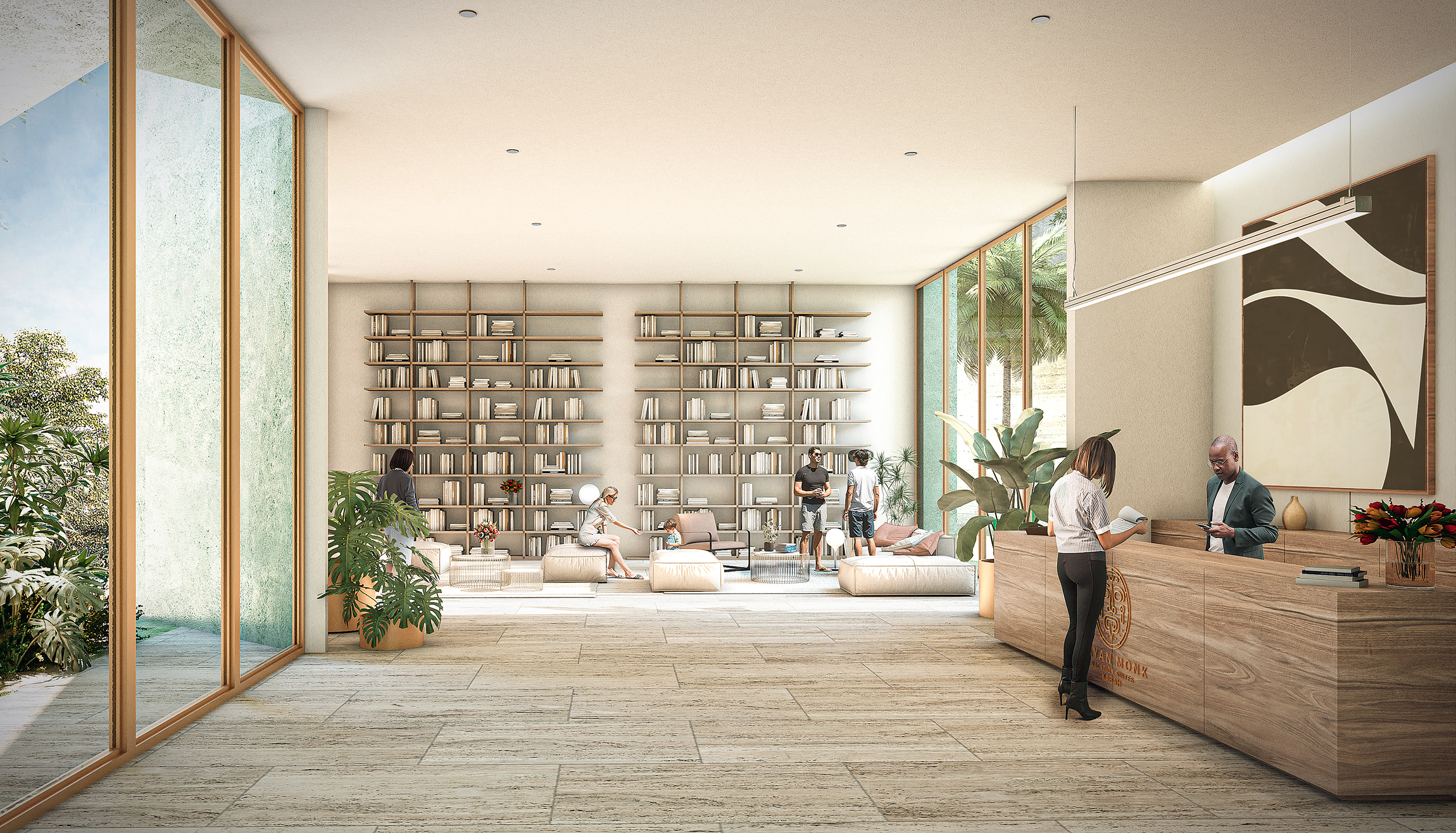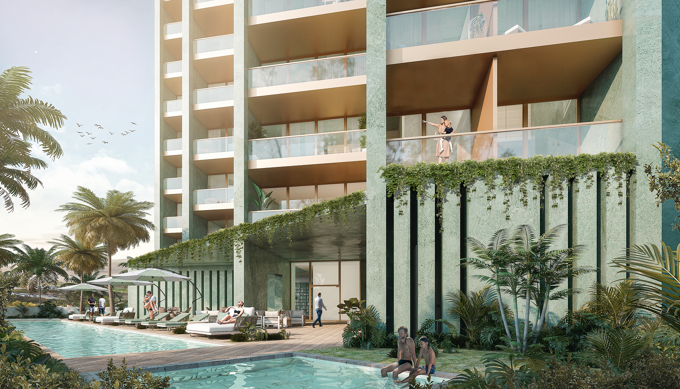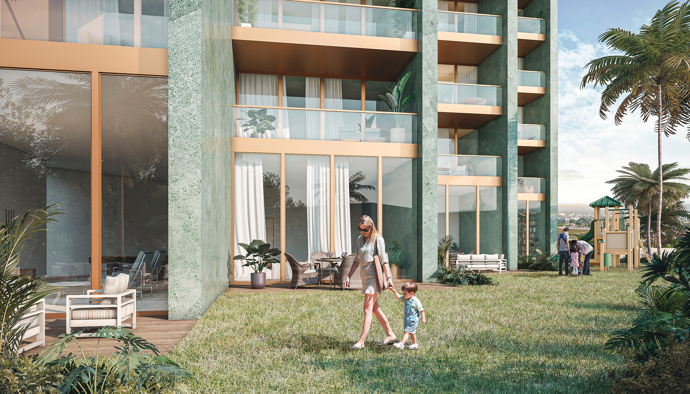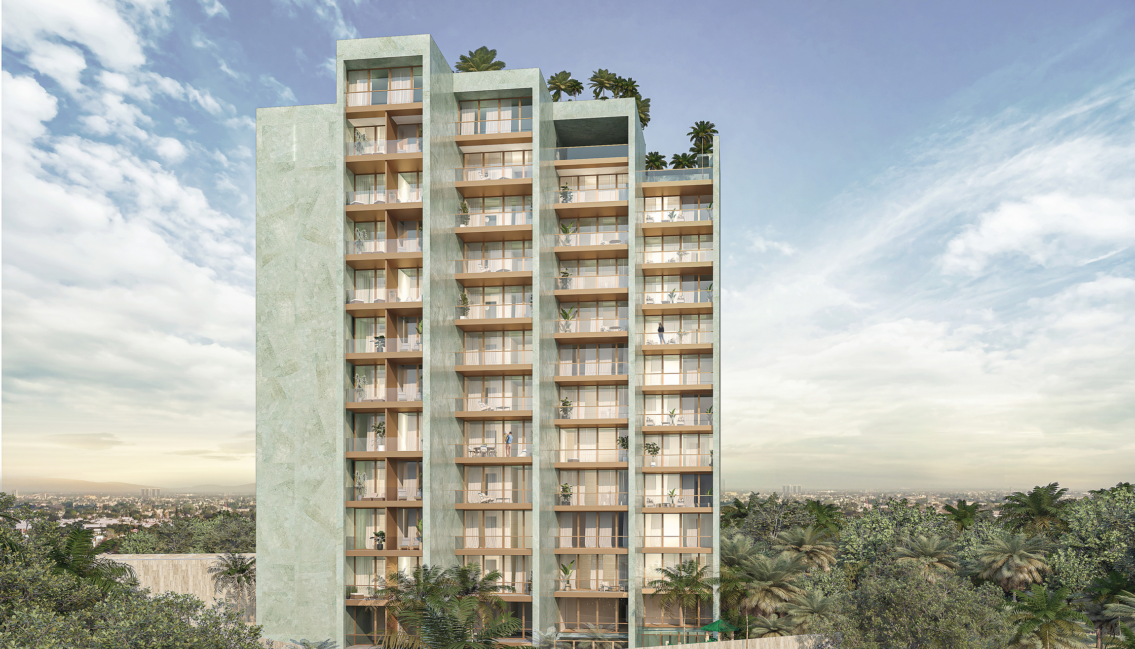 The two towers mirror one another, linked by shared horizontal circulation corridors and anchored by a central vertical core. Seen from the street or the rear, the building appears as a monolithic volume rising from ground to rooftop, its geometry simple and unified. To reduce the visual weight of this mass and soften its presence in the urban fabric, the façades are finished with a textured green cement skin inspired by the shifting tones of the lagoon and the Caribbean Sea. This gesture breaks away from the dominance of white and gray concrete façades in the surrounding developments, rooting the project in its natural context while offering a distinctive identity.