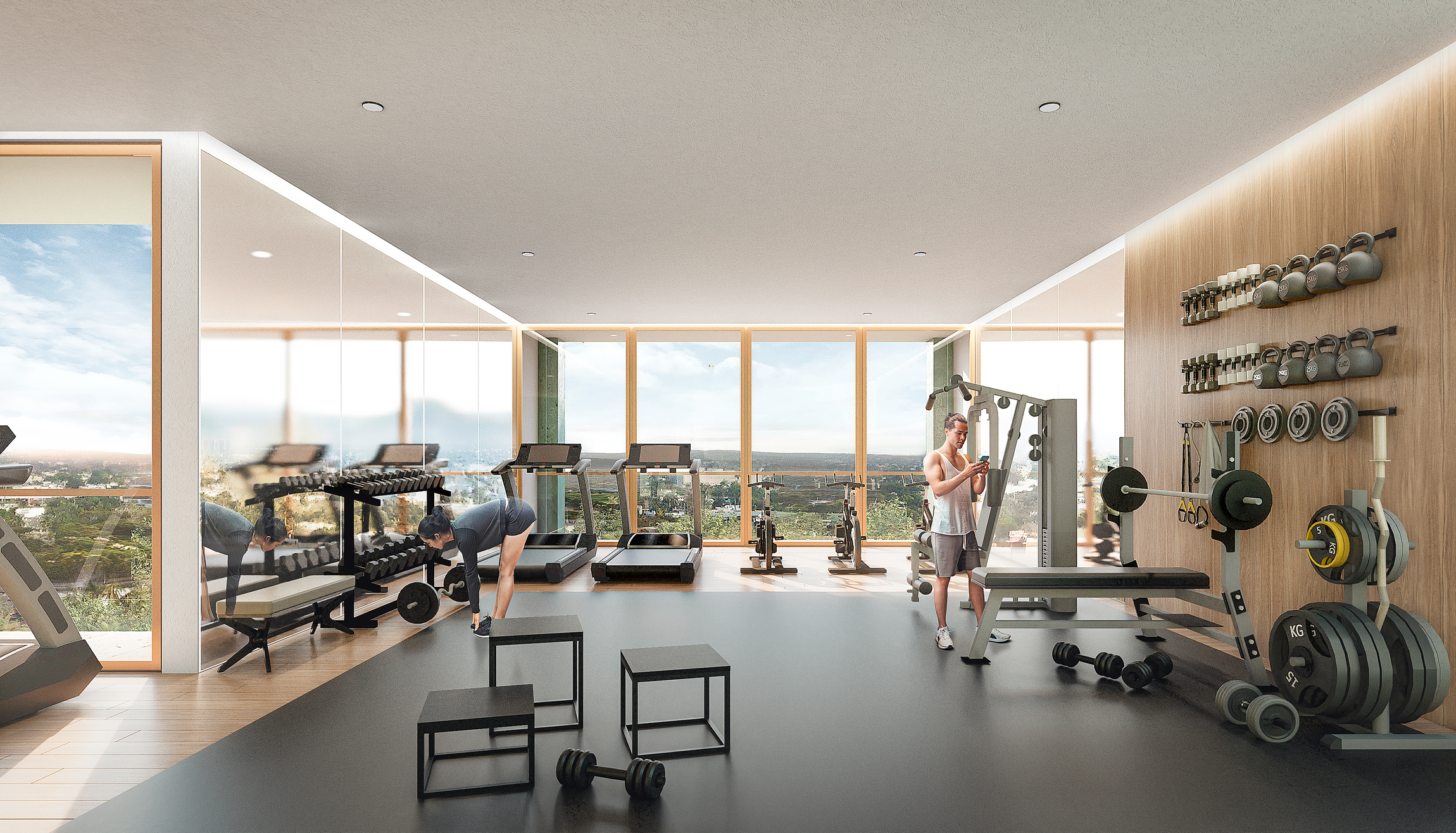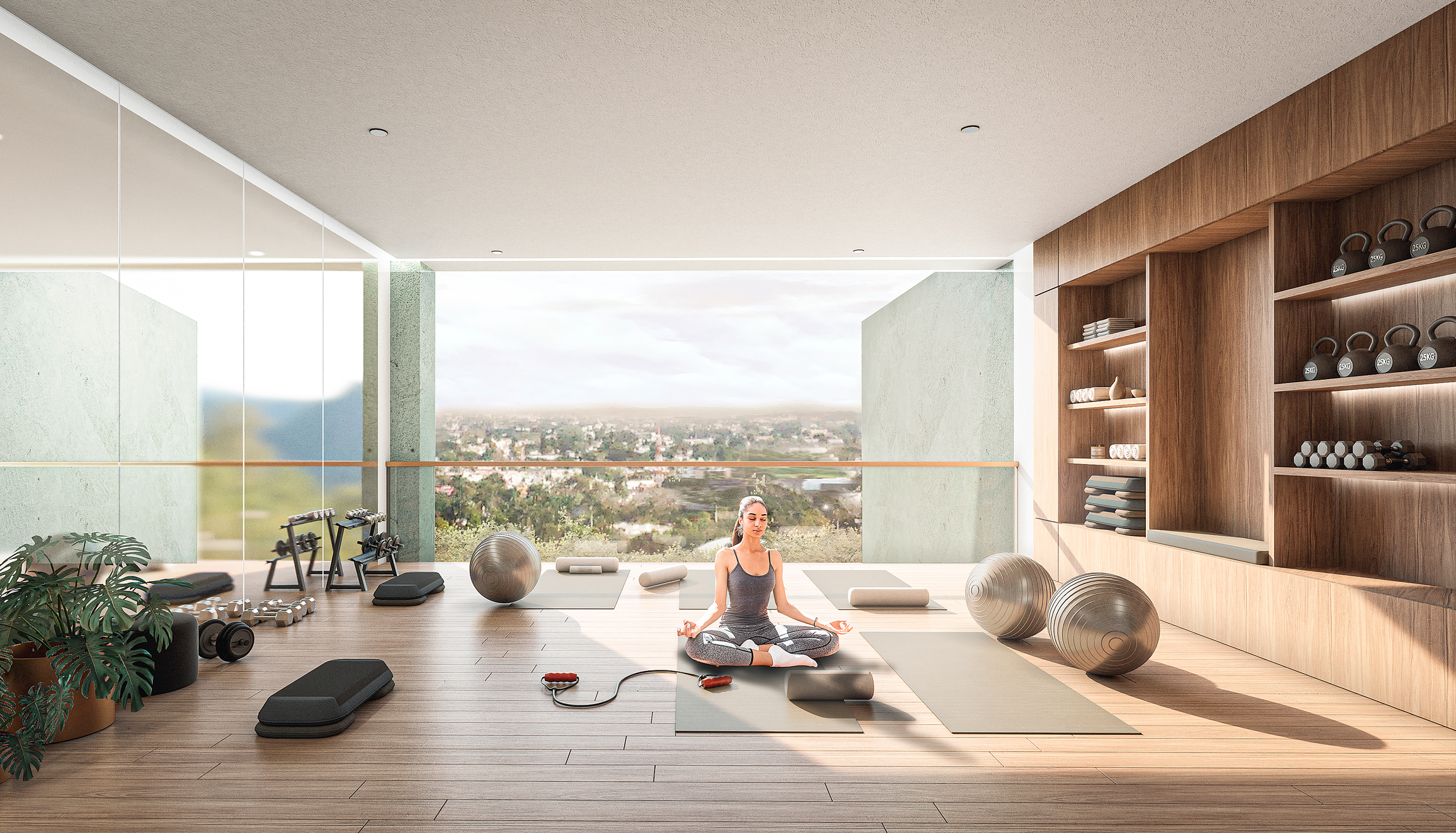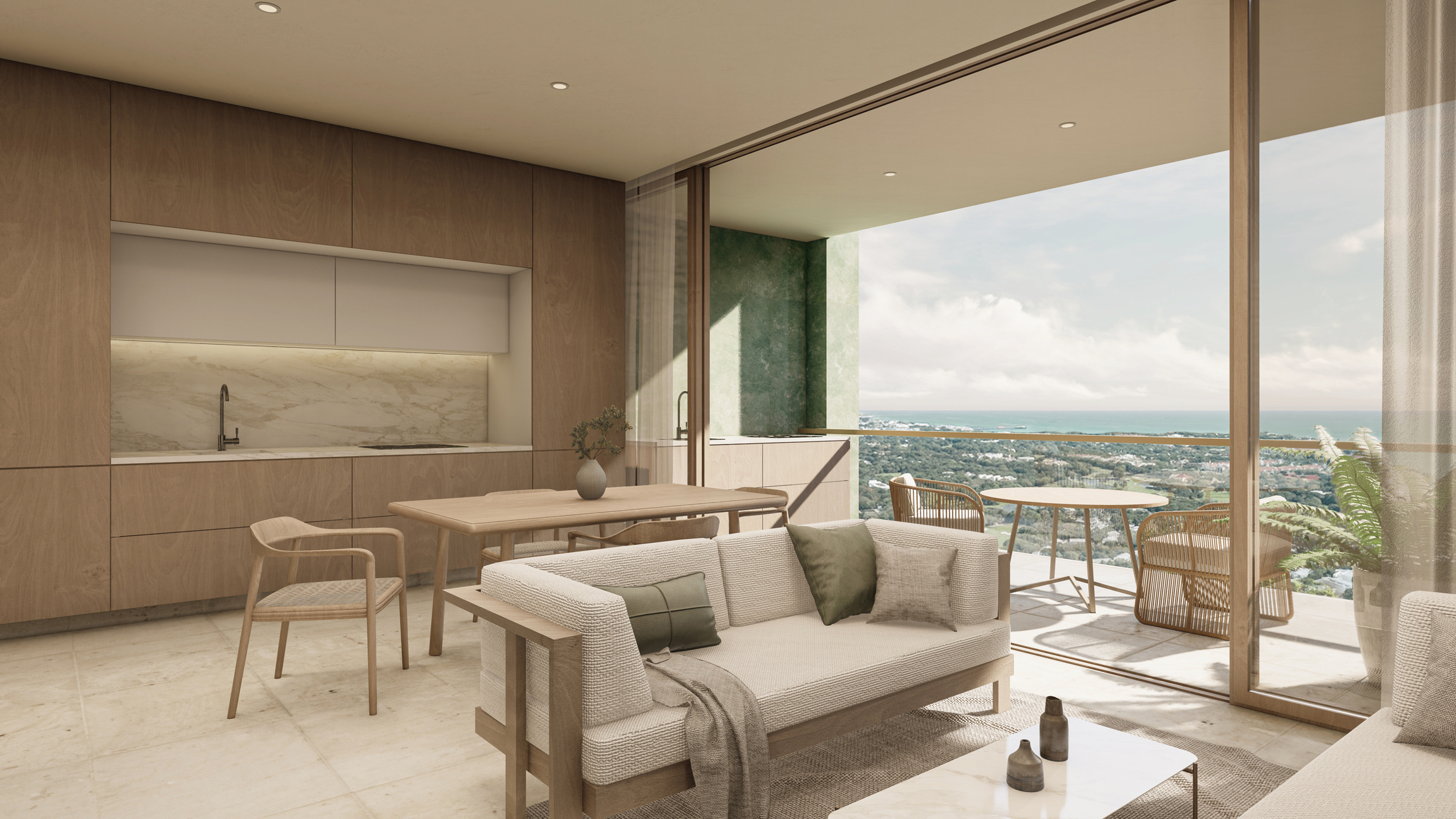 Mayan Monk offers three apartment typologies, ranging from efficient studios to spacious two-bedroom residences, designed to meet diverse lifestyle needs. All residents share access to a series of rooftop amenities, where views reach their most dramatic. A pool, gym, yoga studio, and spa crown the building, creating a communal sanctuary in the sky that blends leisure, wellness, and nature.